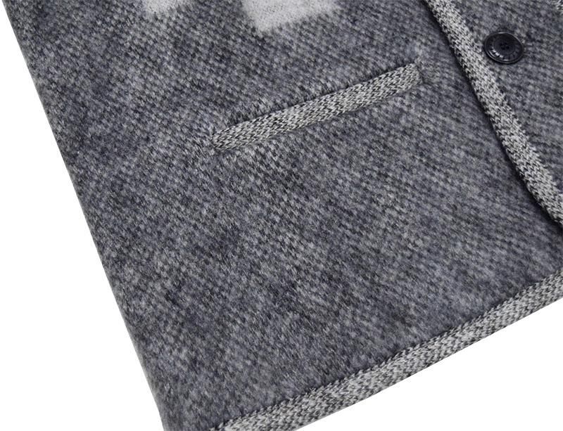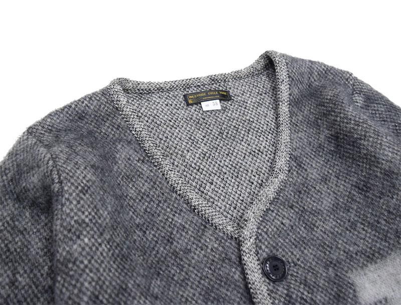 生後一年のアンゴラ山羊から取る0.27-0.35太さの糸を贅沢に使用したキッドモヘアで仕上げたカーディガン。デザインモチーフはウエストライドが得意とするVINTAGE NATIVE AMERICANのSWASTIKA。柄とトーンに拘り、4種の糸を使用して製作する大変贅沢な一枚です。混毛と掻き具合で上質な雰囲気に仕上げたダブル・ジャガードは着用感も素晴らしく、保温性にも非常に優れています。見返しやパイピングなどの各部ディテールにも一切の抜かりはありません。