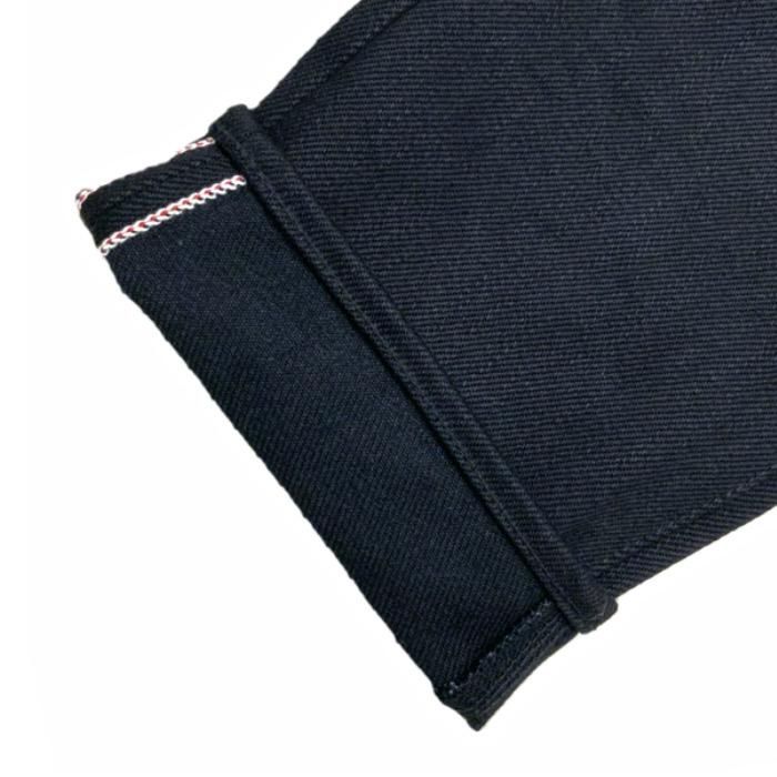 定番の25ozセルビッチ生地 タテ糸、ヨコ糸ともにブラック糸を使用して織り上げたセルビッチ。
