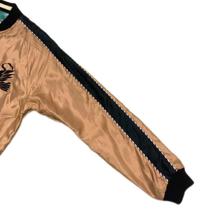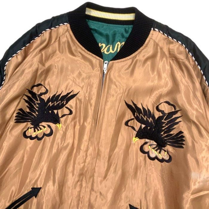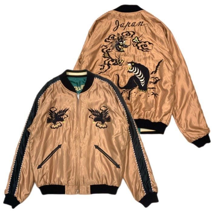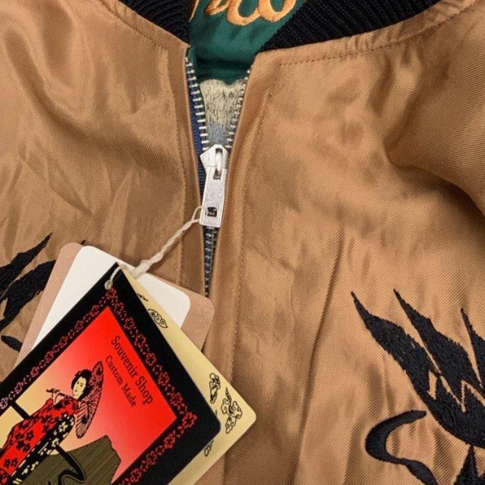 表面はヴィンテージでも非常に珍しいライトブラウンのボディ。1950年代中期の作品をもとに、背中には睨み合う龍虎、胸には鷲の絵柄が黒を基調とした色糸で刺繍されている。身頃と袖下を同じ色で統一したライトブラウン単色のボディに黒い刺繍、袖山のラインとリブも黒の単色を組み合わせることで、洗練された仕上がりとなっている。