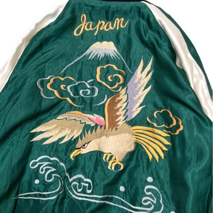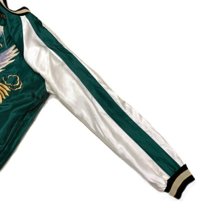 リバーシブル面は獲物を求めて海上を滑空する鷲の刺繍。写実的ではなく程よくデフォルメされた絵柄には当時の職人のセンスが感じられる。刺繍の色糸は経年変化で褪色した淡い色味を再現しており、ライトオレンジのJAPANの文字がグリーンのアセテートに映える。胸には龍虎の刺繍が施され、両面ともスカジャンの三大モチーフである鷲・虎・龍が揃った贅沢な1着。