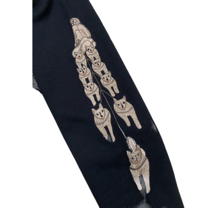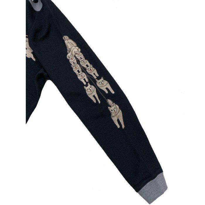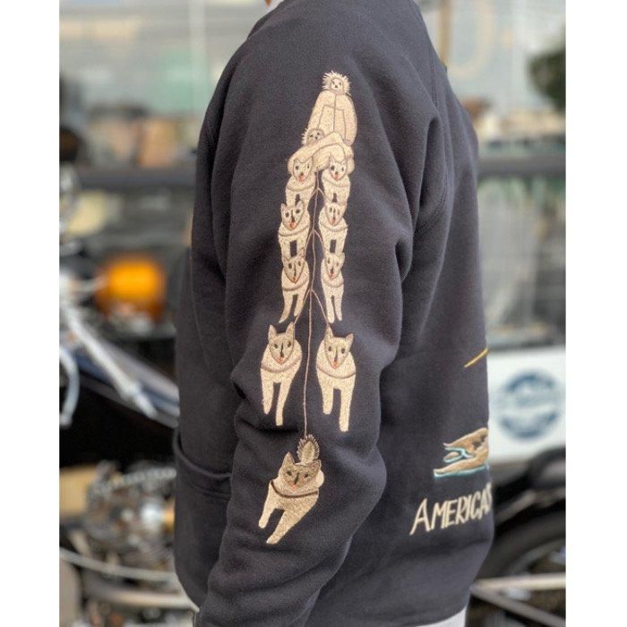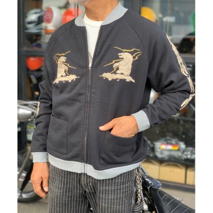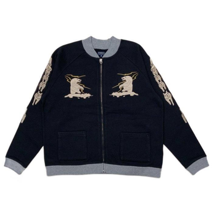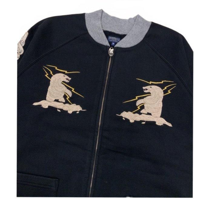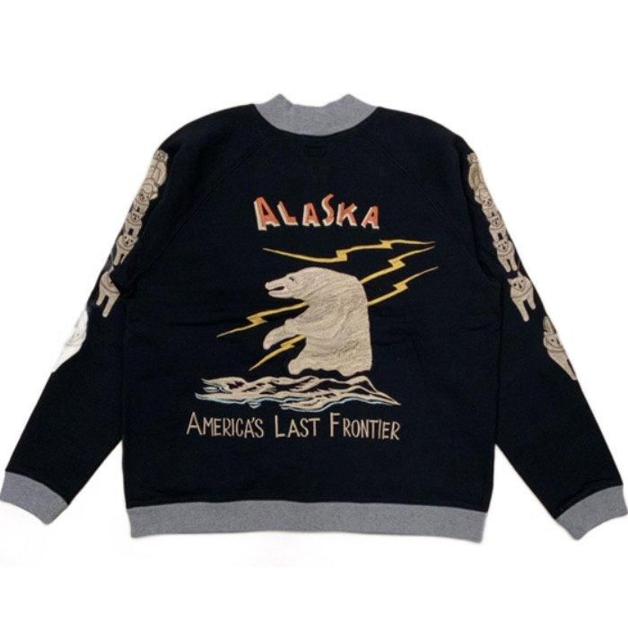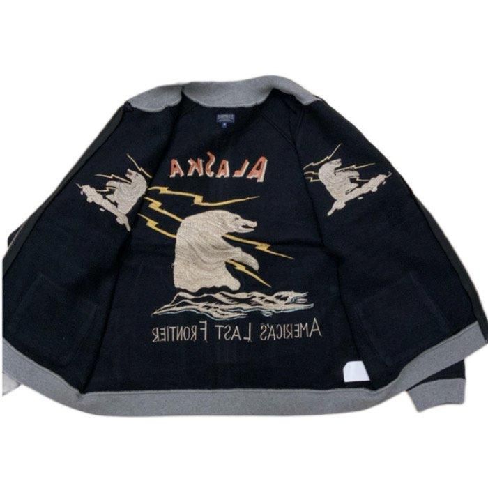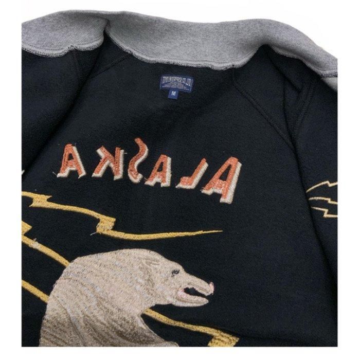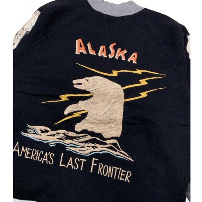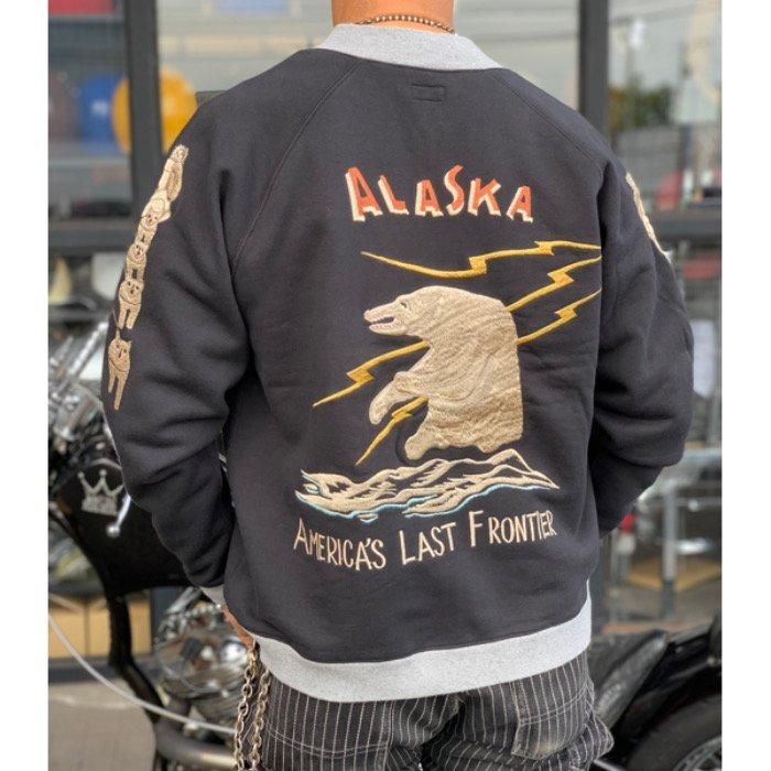 スカジャンの柄の中で有名なアラスカ柄を刺繍したジップスウェット。ボディに刺繍された著名な稲妻と白熊の絵柄は非常に人気が高く、また両袖には犬ぞりの刺繍も施された迫力のあるデザインがとてもかっこいいスウェットシャツ。着用を繰り返すことで、アセテートとはまた異なるスウェットならではの風合いが楽しめます。