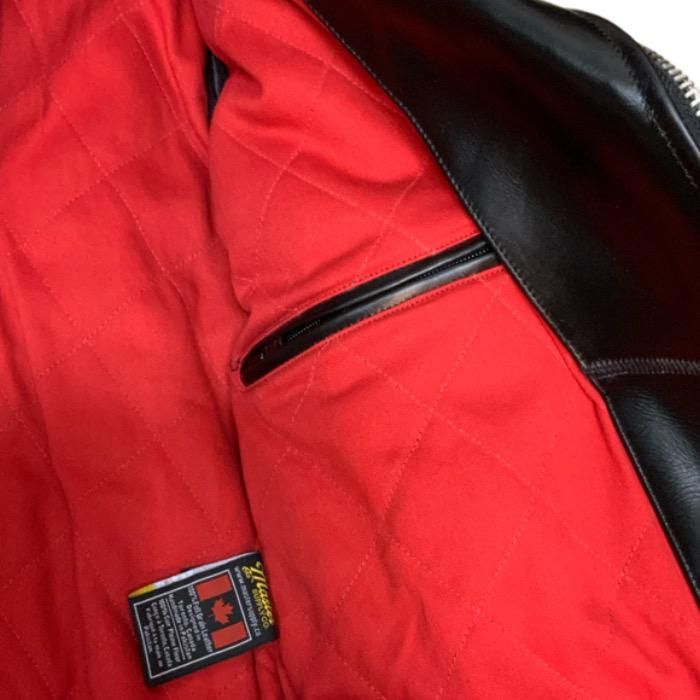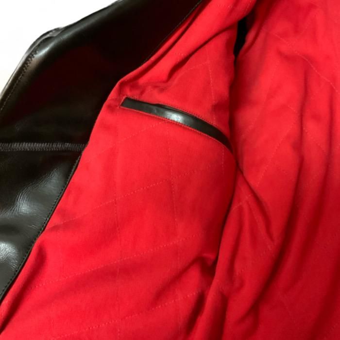 裏地はキルティングステッチで補強された100%コットンの赤いツイル。
