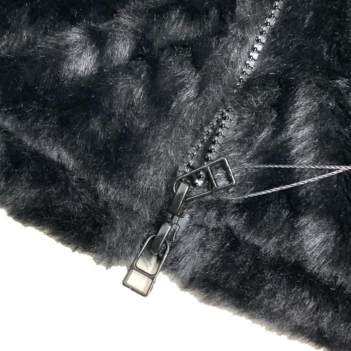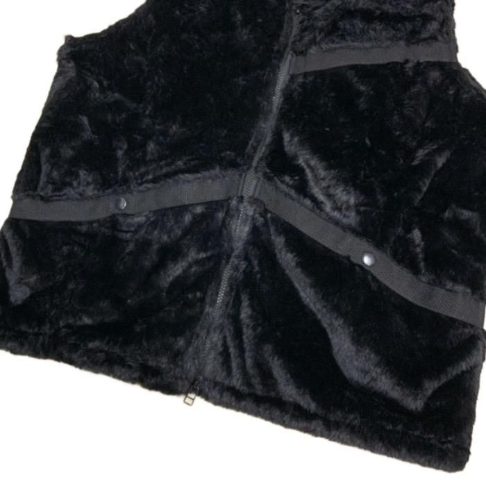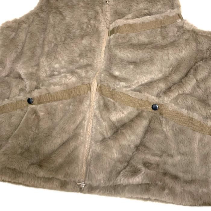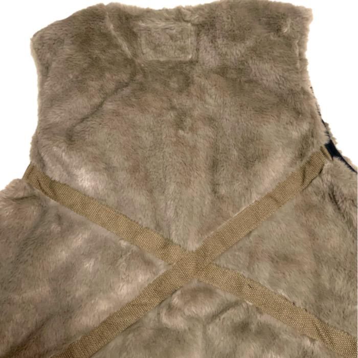 古着のエスキモージャケットをVin&Age的にアレンジしたファーベスト。 ’70モノによくみるチロリアンテープをコットンテープ替え、背中のクロスデザイン等で バイカーテイストにまとめました。 冬のアウターの上から羽織れるサイズ設定。