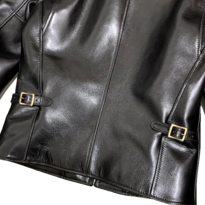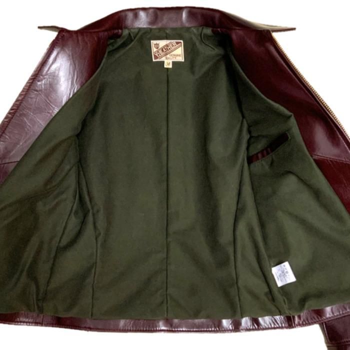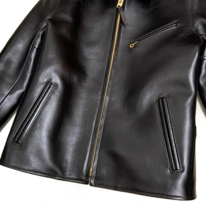 ホースハイド専業のタンナーにて、ステア特有の厚みを活かしつつ、アニリン染料で仕上げることによりホースのようなきめ細かい銀面と透明感のある発色を実現したアニリンステアを使用したシングルライダース。Y'2 LEATHER定番の42シリーズの細身のライダースの型に、1.5mm前後の厚みがあるので、エイジングも期待できる一着。