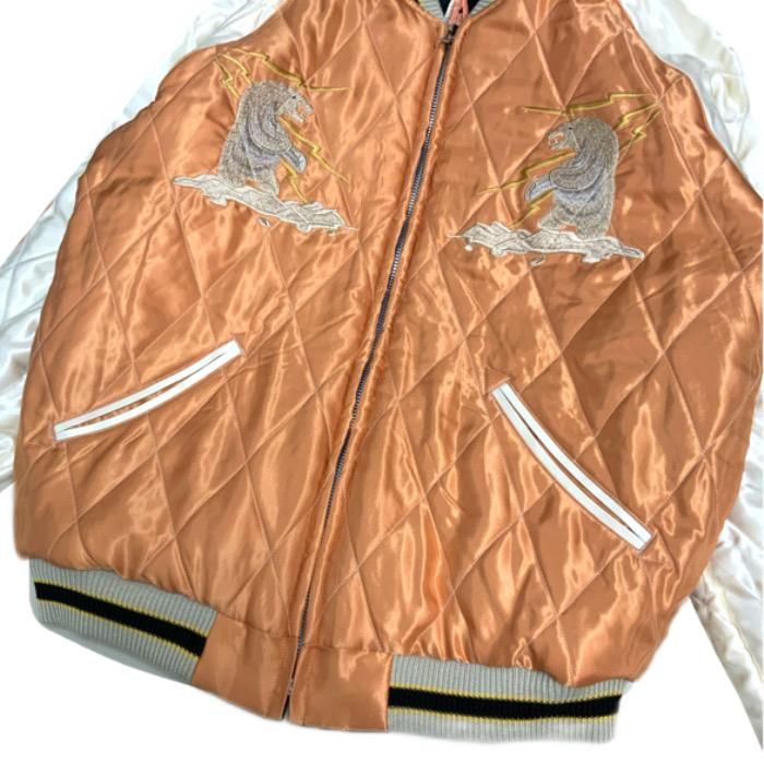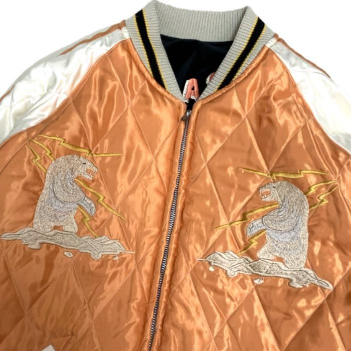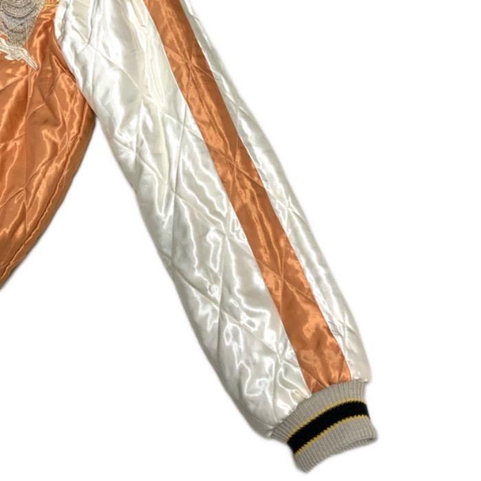初期のスーベニアジャケットはアセテート生地のリバーシブル仕様が多いが、当時のバリエーションとして毛羽感のある別珍(べっちん)生地を使ったモデルも存在する。中綿を入れることで防寒性を高め、リバーシブル面のアセテートには中綿を押さえるためのキルティングが施されていた。