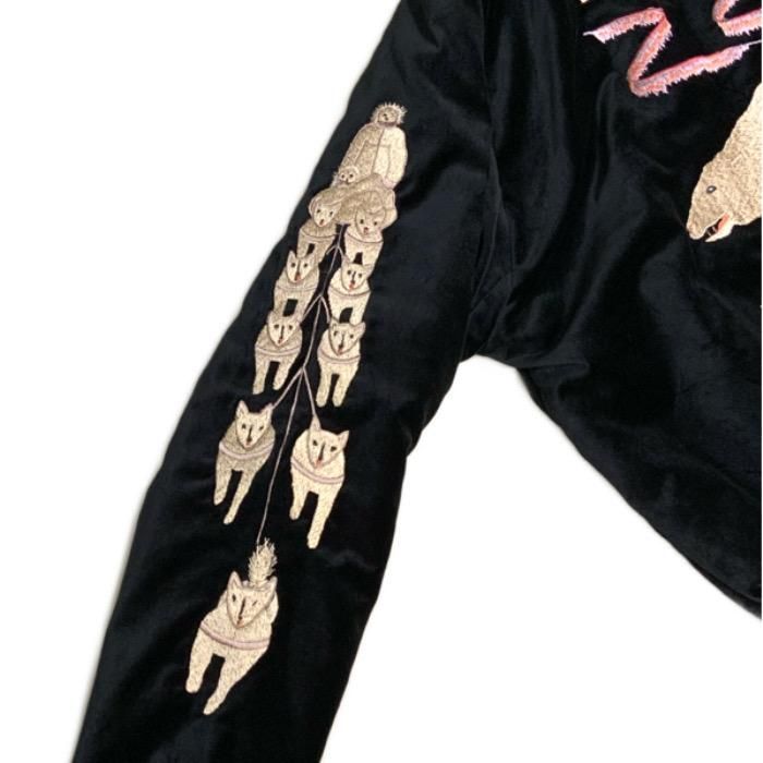 アラスカをモチーフとした通称「アラスカジャン」。稲妻と白熊の柄が有名だが、この流氷と白熊の柄も実在するヴィンテージを再現。ただでさえ希少なアラスカジャンのなかでもスーパーレアな一着と言えるだろう。共に描かれているのは極寒の地でしか見ることのできないオーロラ。袖には人気の犬ぞりの刺繍も入っている。
