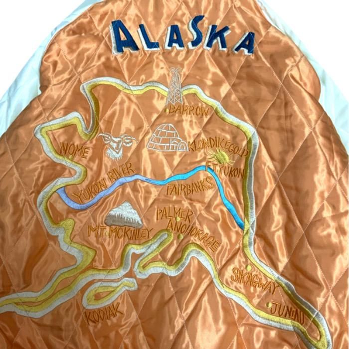 リバーシブル面はアラスカのマップ柄。ブルーのALASKA の文字は、オレンジのボディとの組み合わせならではの配色。1950 年代後期に米軍から依頼され「港商」が製作し、アラスカ米軍基地内のPXに並んだ作品で、当時はアラスカの写真やポストカードをもとに職人が絵柄をデザインしていた。