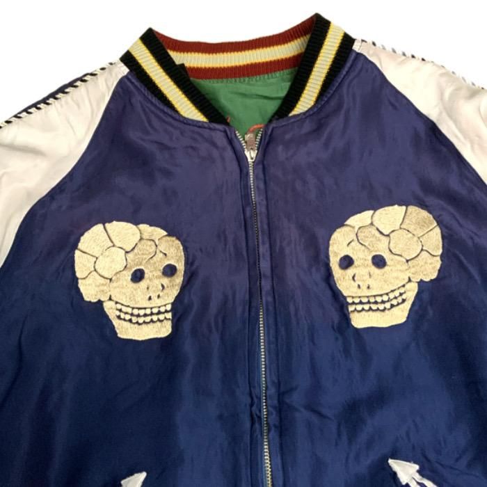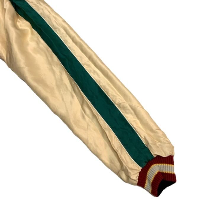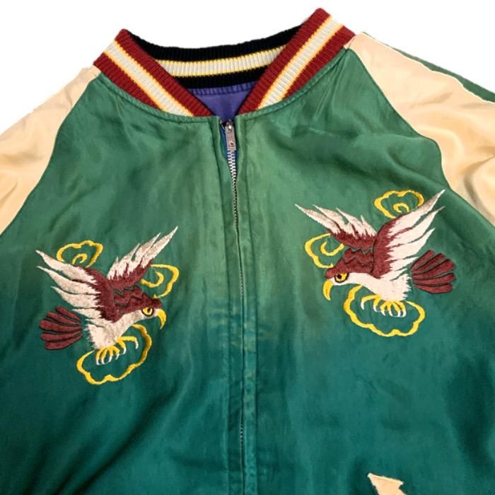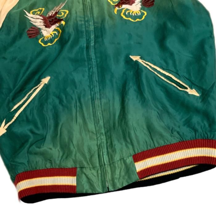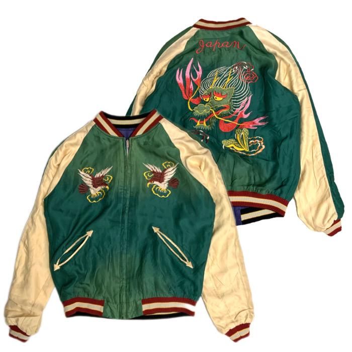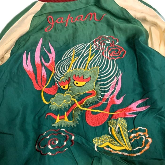 リバーシブル面は龍の頭部を細部まで描写した通称「ドラゴンヘッド」と呼ばれる絵柄。淡いグリーンの龍の顔や朱色の炎などは、当時の日本ならではの刺繍糸の色味。グリーンのボディに対して補色である刺繍の赤を馴染ませるため、リブにも赤を配することで全体に統一感が生まれている。