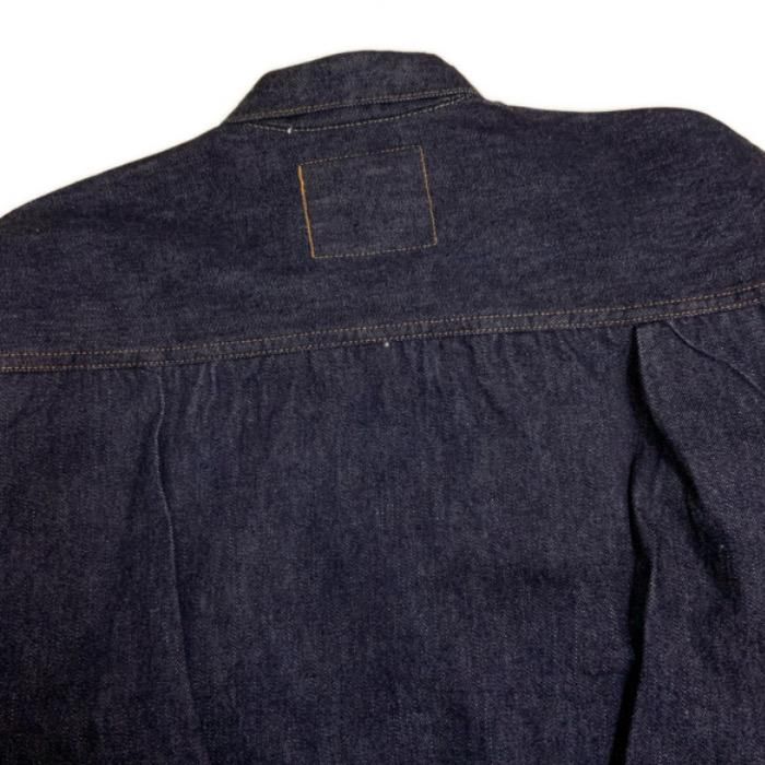 左胸ポケットのフラップの裏側にはライトオンスデニムを使用し、前身頃の身返し端にはセルビッジが見られるのが特徴です。ワンウォッシュ。